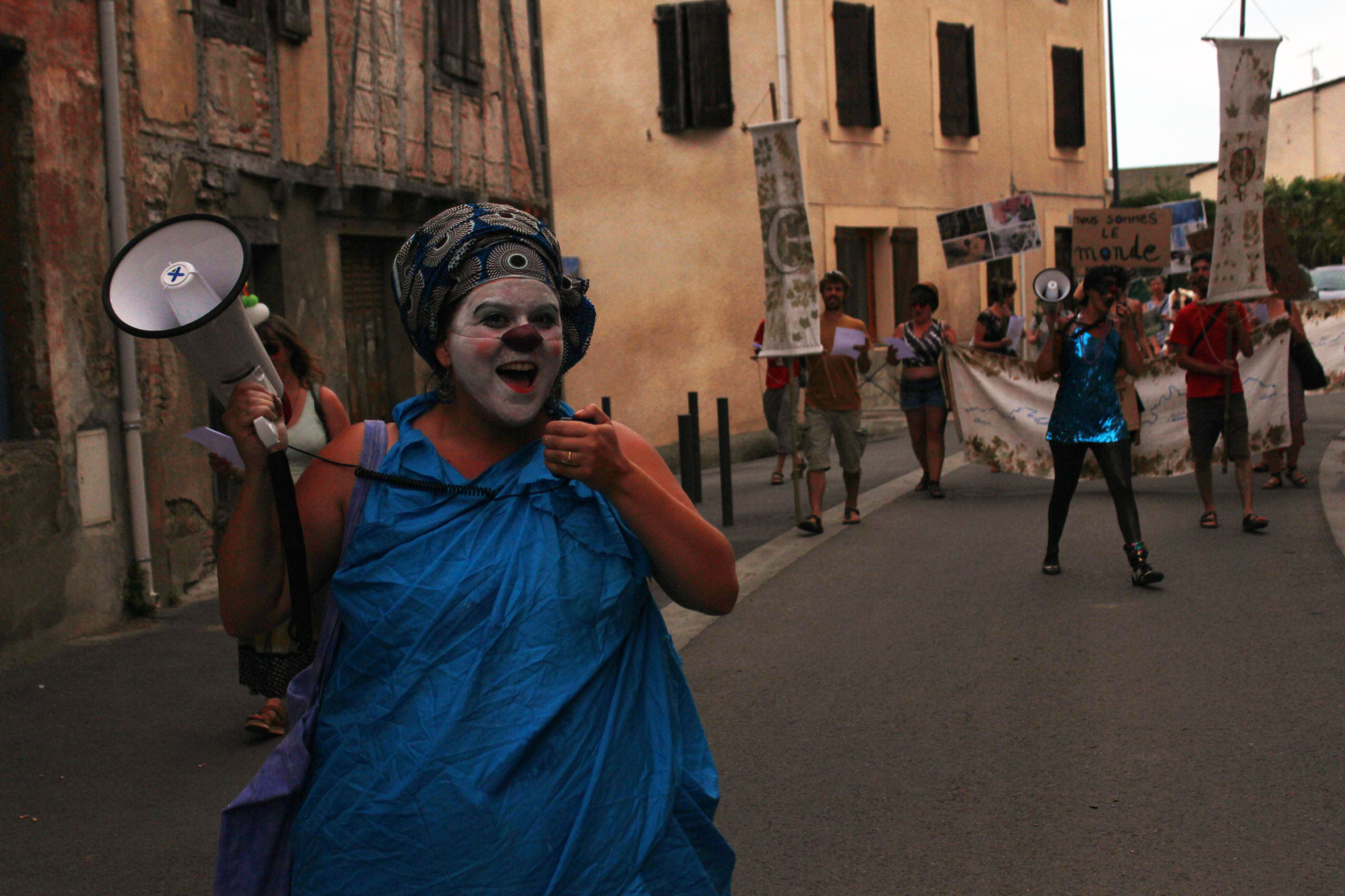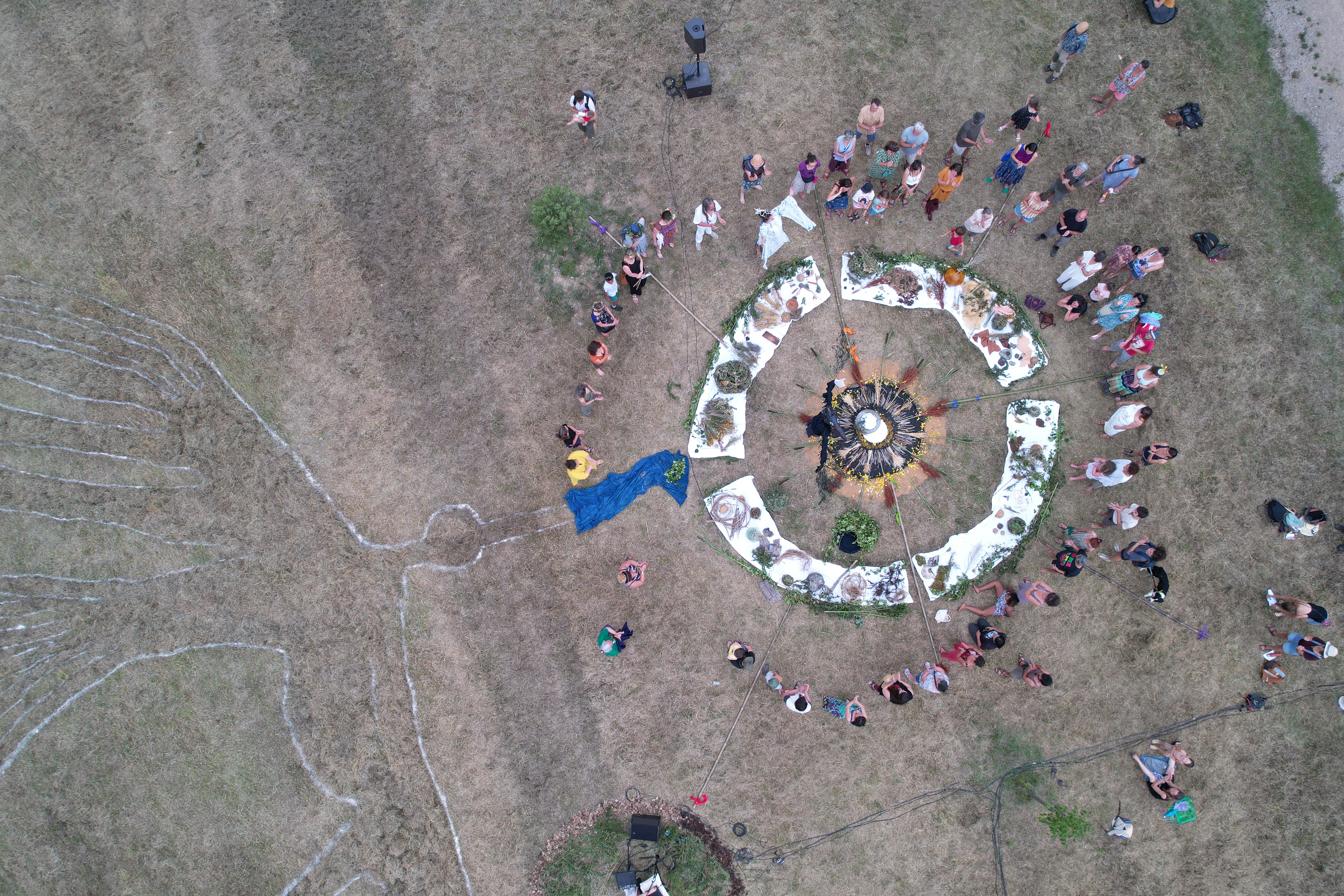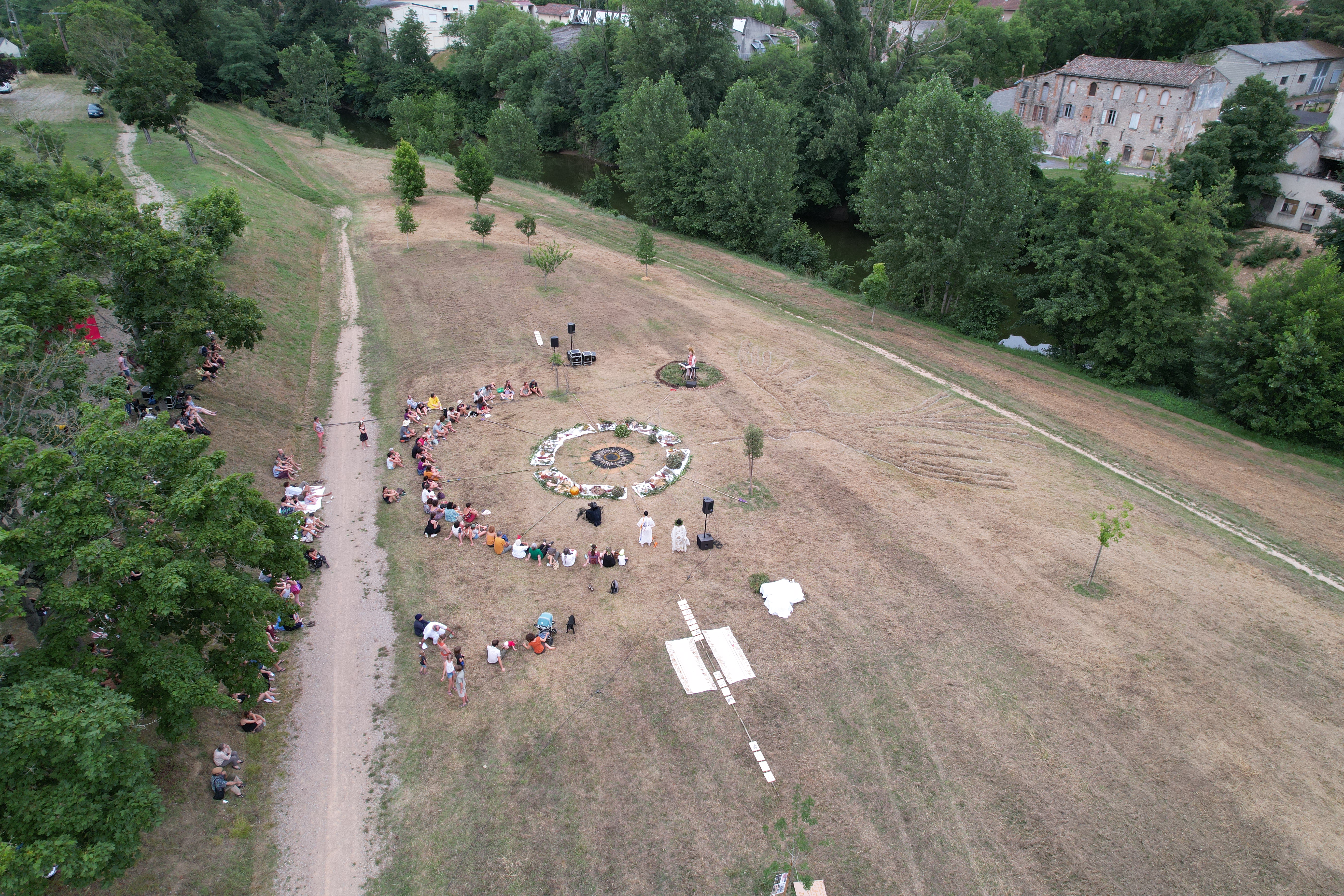 Nous avons déambulé depuis la place du Jourdain et cheminé sous la forme d’un étrange cortège mené par Azterg et Bouchon, clownes sorcières, le long du Dadou jusqu’au pré de la crèche des Moussaillons (avenue de Provence). Là, un grand cercle nous attendais. Un observatoire astronomique magique, inspiré par les anciens calendriers solaires.